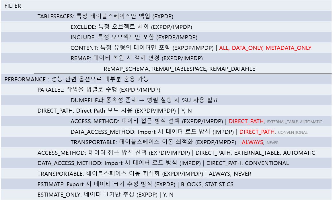 datapump 옵션이 생각보다 많고 그에따라 옵션 조합도 많이 있어 눈으로 보기 쉽게 정리해보았다.
